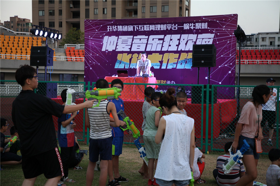 7月29日傍晚7點(diǎn)多,德清體育中心足球館內(nèi)不見(jiàn)足球橫飛,卻見(jiàn)水花四濺,集團(tuán)所屬企業(yè)升華金融“蝸牛聚財(cái)”平臺(tái)上線一周年慶?;顒?dòng)之一的水槍大戰(zhàn)在這里激情上演。翌日,該公司又舉辦了一場(chǎng)親子活動(dòng)。 ▲仲夏夜之水槍大戰(zhàn) ▲小伙,挺??!▲知道什么叫腹背受敵了吧!▲看我水…