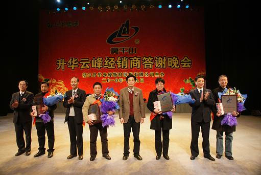 1月9日,集團(tuán)所屬企業(yè)云峰新材2009年度經(jīng)銷商答謝晚會在縣會展中心隆重舉行,會議表彰獎勵了24位優(yōu)秀經(jīng)銷商。集團(tuán)公司董事長夏士林、總經(jīng)理吳夢根,云峰新材董事長顧水祥、總經(jīng)理嵇小璋向獲得突出貢獻(xiàn)獎的經(jīng)銷商頒發(fā)獎牌和獎品。吳夢根代表集團(tuán)公司致賀詞。顧水祥代表云峰新材致歡迎詞。 24位優(yōu)秀經(jīng)銷商分獲突出貢獻(xiàn)獎、最佳進(jìn)步獎、最佳專賣店獎。集團(tuán)公司經(jīng)理層成員參加了這次晚會。