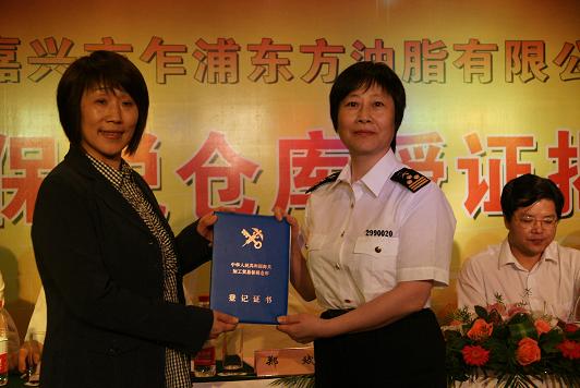 9月29日,浙江輕紡所屬企業(yè)嘉興市乍浦東方油脂有限公司彩旗招展,花團(tuán)錦蔟,由中國海關(guān)批準(zhǔn)設(shè)立的浙江省首個(gè)動(dòng)植物油脂公用型保稅倉庫正式在這里掛牌。杭州海關(guān)、嘉興海關(guān)、嘉興港區(qū)等有關(guān)部門領(lǐng)導(dǎo),集團(tuán)公司董事長夏士林,浙江輕紡董事長兼東方油脂公司董事長郭蘊(yùn)華等參加了授證、揭牌儀式。