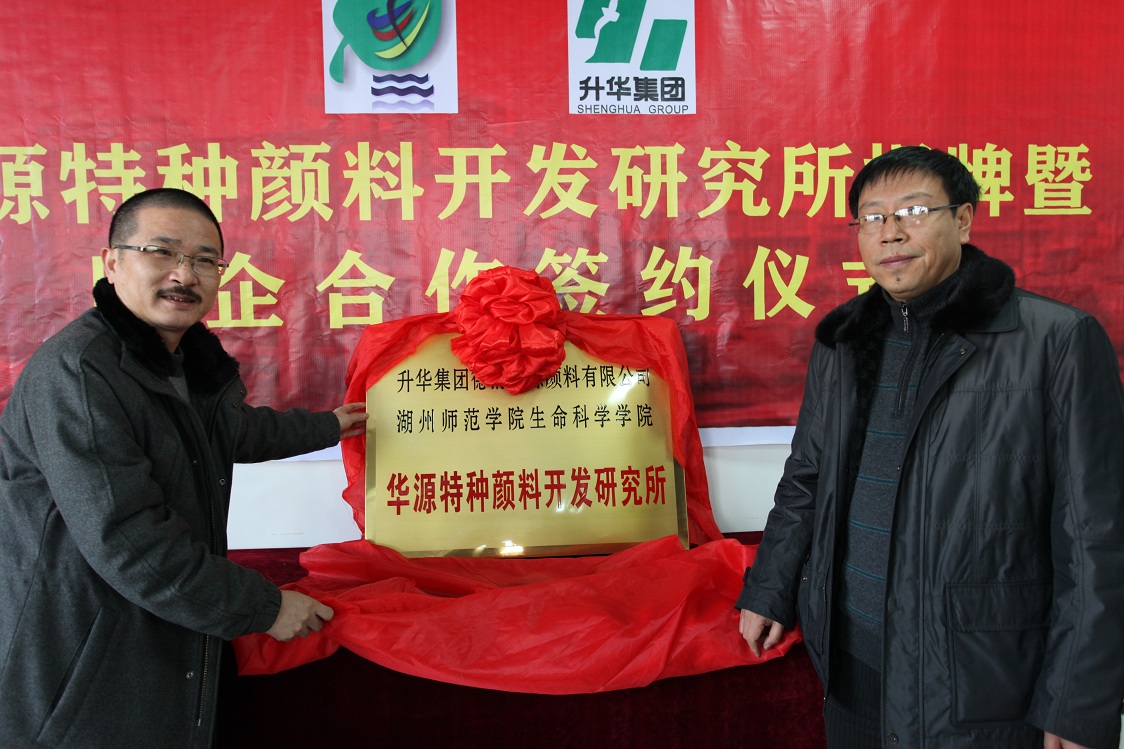市經(jīng)信委、市科技局有關部門負責人,湖州師范學院生命科學學院院長李彬、黨委書記錢學芳、副院長曹楓,華源顏料董事長兼總經(jīng)理竺增林、副總經(jīng)理馮阿榮等參加了揭牌暨簽約儀式。
