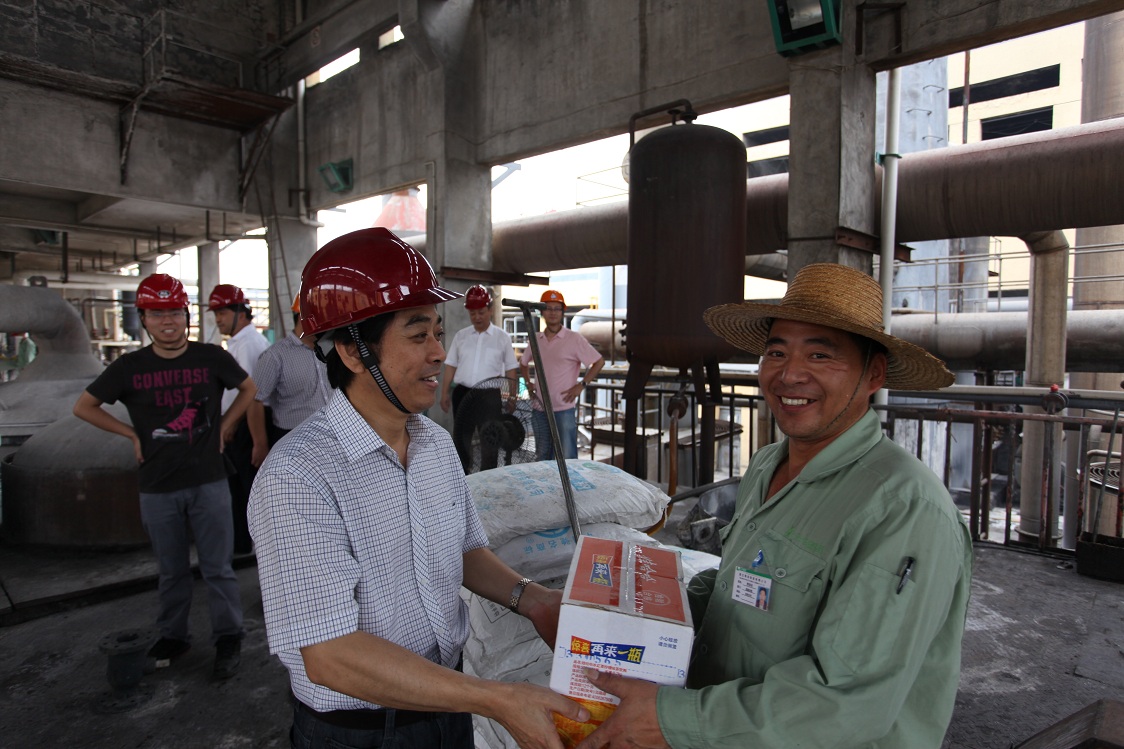 7月26日下午2點(diǎn)整,正值當(dāng)天的高溫時(shí)段,集團(tuán)所屬企業(yè)升華拜克董事長(zhǎng)兼總經(jīng)理張文駿、副總經(jīng)理吳松根等帶隊(duì)到本部各分廠慰問(wèn)堅(jiān)守在生產(chǎn)一線的廣大員工,為他們送去了解暑的飲料(見(jiàn)圖④)。