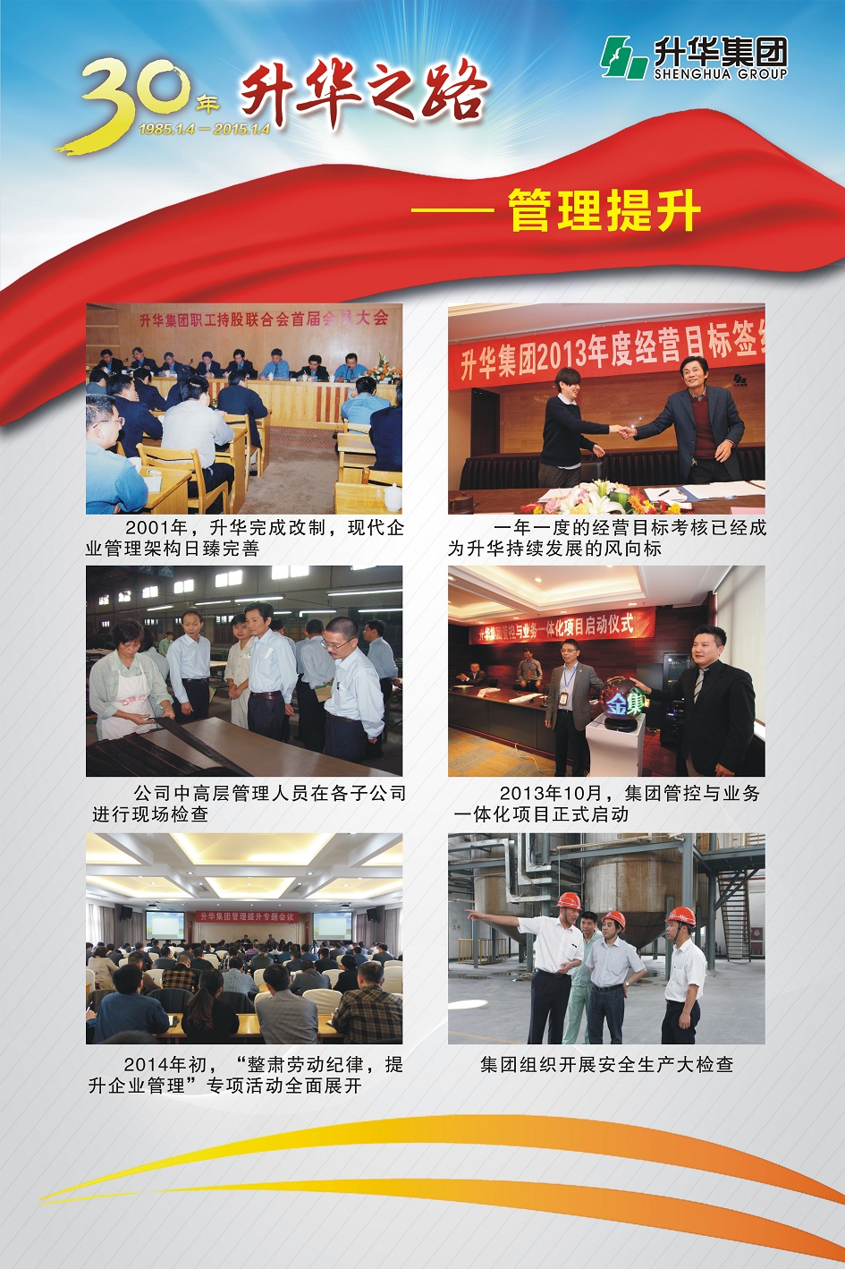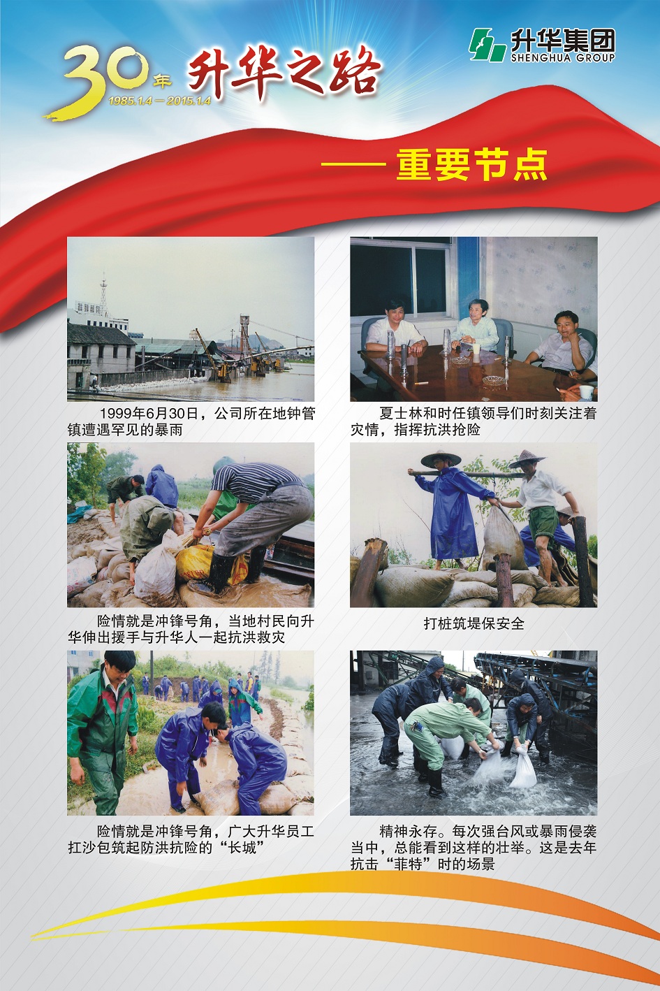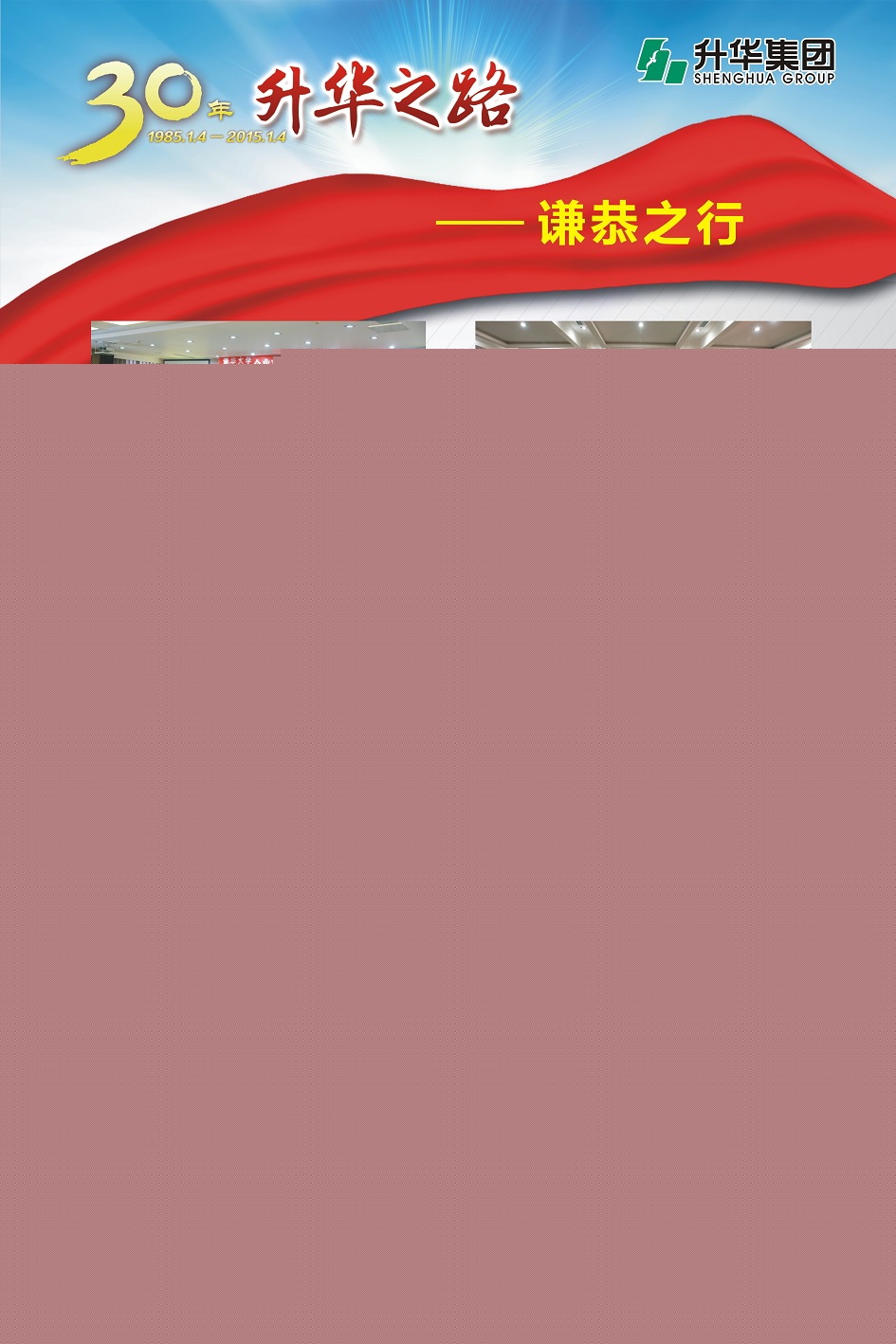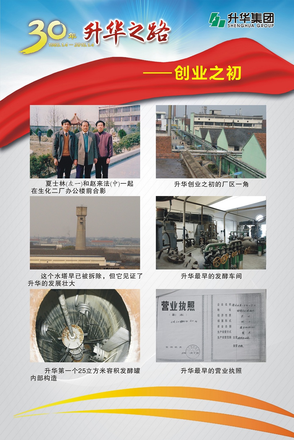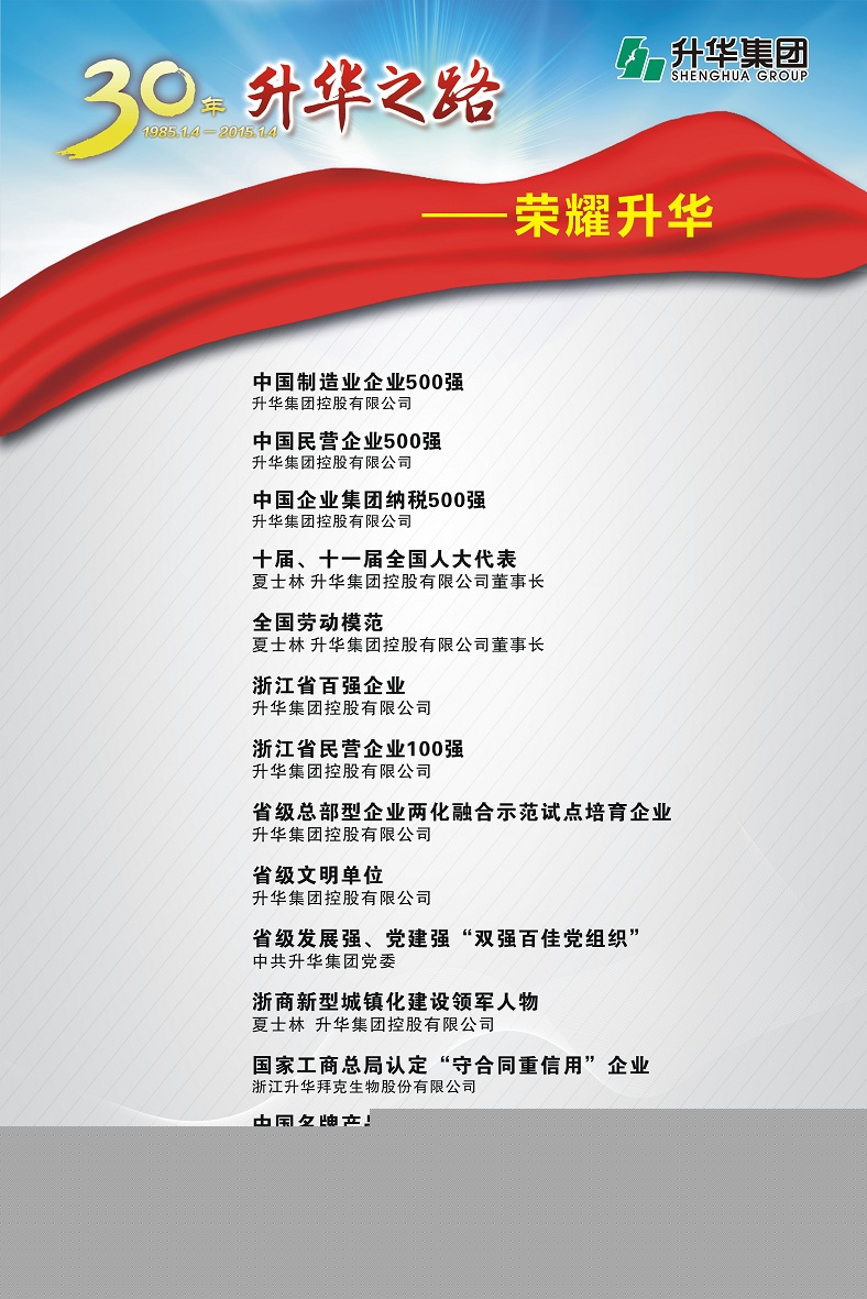 升華集團(tuán)即將迎來(lái)創(chuàng)立30周年。30年,半個(gè)甲子,在風(fēng)和日麗與驚濤駭浪中,升華艦隊(duì)揚(yáng)帆遠(yuǎn)航,經(jīng)受風(fēng)雨的洗禮,也收獲成功的喜悅。為了喜迎升華創(chuàng)立30周年,回眸升華走過(guò)的不同尋常的征程,本報(bào)特意收集了“30年升華之路”系列圖片,陸續(xù)在集團(tuán)所屬各子公司巡回展出。圖片展的內(nèi)容分為創(chuàng)業(yè)之初、領(lǐng)導(dǎo)關(guān)懷、重要節(jié)點(diǎn)、黨群共建、管理提升、品牌升華、踐行責(zé)任、謙恭之行、轉(zhuǎn)型升級(jí)、榮耀升華等章節(jié)。