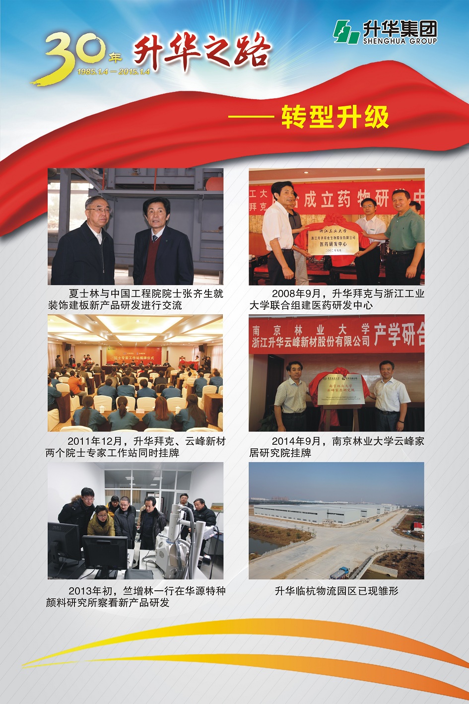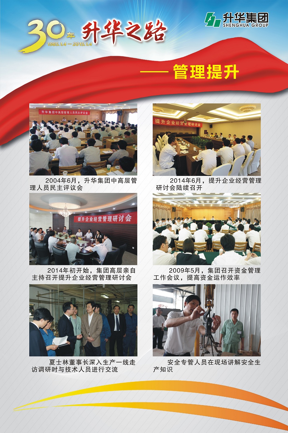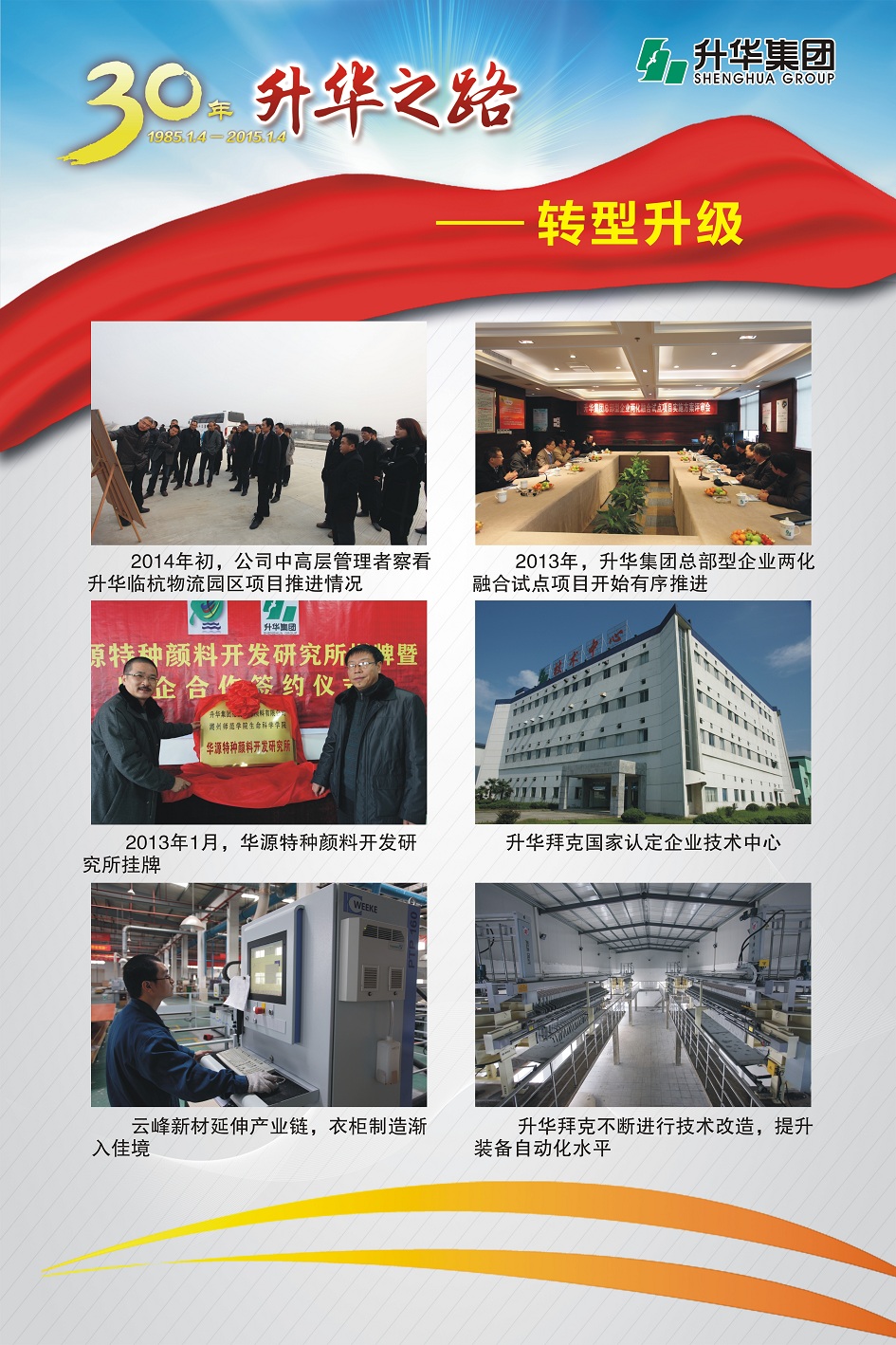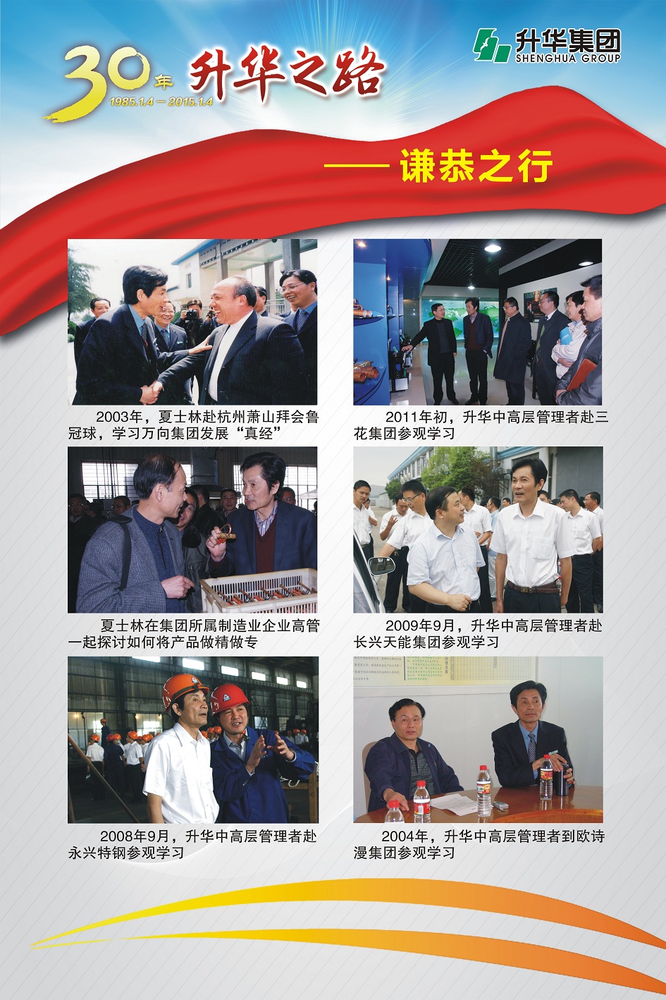 升華集團(tuán)即將迎來(lái)創(chuàng)立30周年。30年,半個(gè)甲子,在風(fēng)和日麗與驚濤駭浪中,升華艦隊(duì)揚(yáng)帆遠(yuǎn)航,經(jīng)受風(fēng)雨的洗禮,也收獲成功的喜悅。為了喜迎升華創(chuàng)立30周年,回眸升華走過(guò)的不同尋常的征程,本報(bào)特意收集了“30年升華之路”系列圖片,陸續(xù)在集團(tuán)所屬各子公司巡回展出。圖片展的內(nèi)容分為創(chuàng)業(yè)之初、領(lǐng)導(dǎo)關(guān)懷、重要節(jié)點(diǎn)、黨群共建、管理提升、品牌升華、踐行責(zé)任、謙恭之行、轉(zhuǎn)型升級(jí)、榮耀升華等章節(jié)。