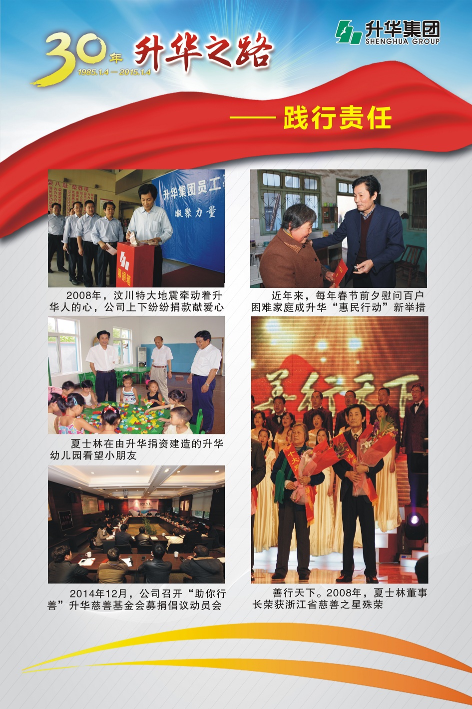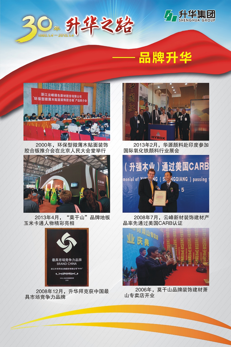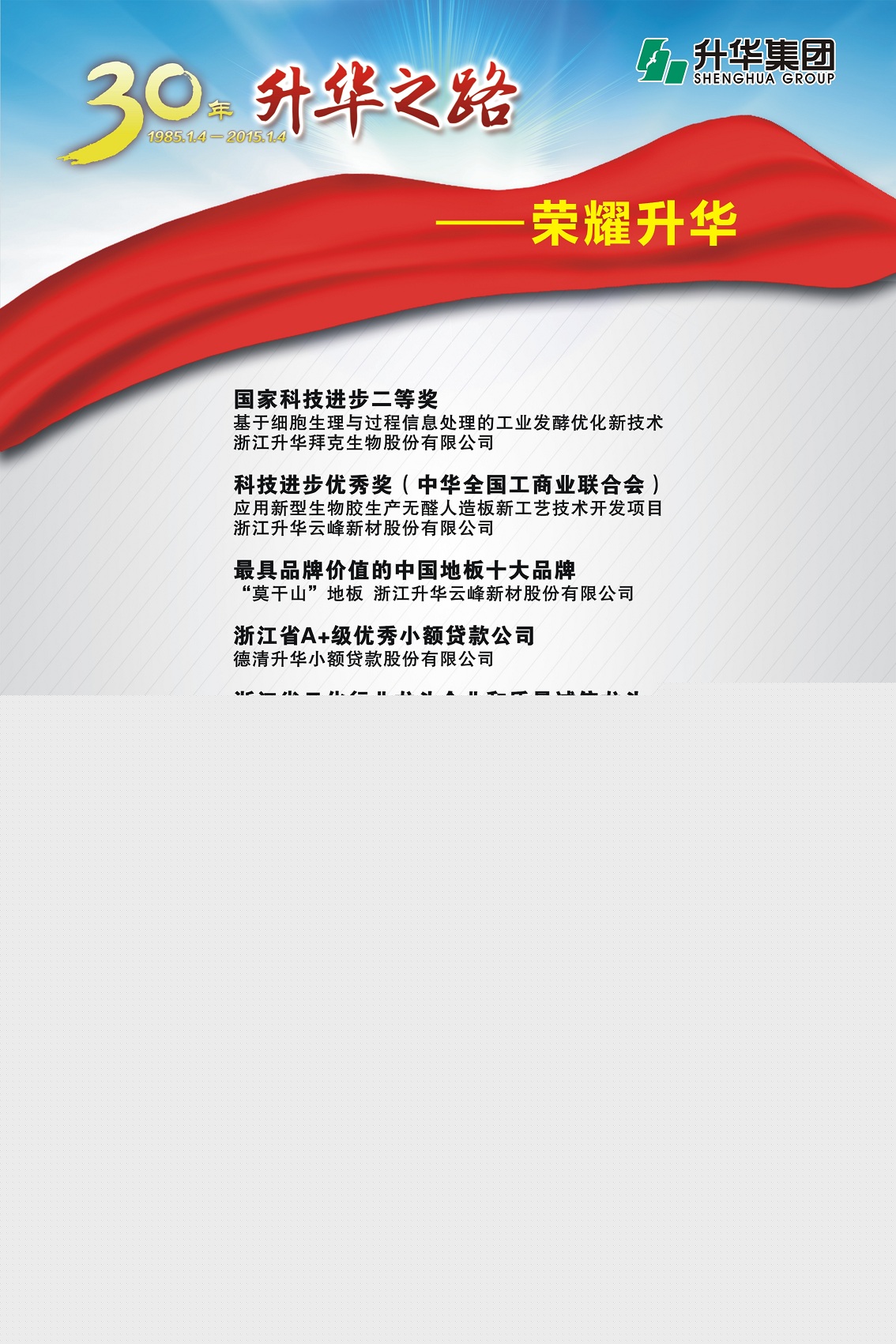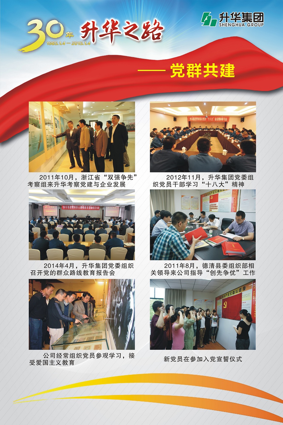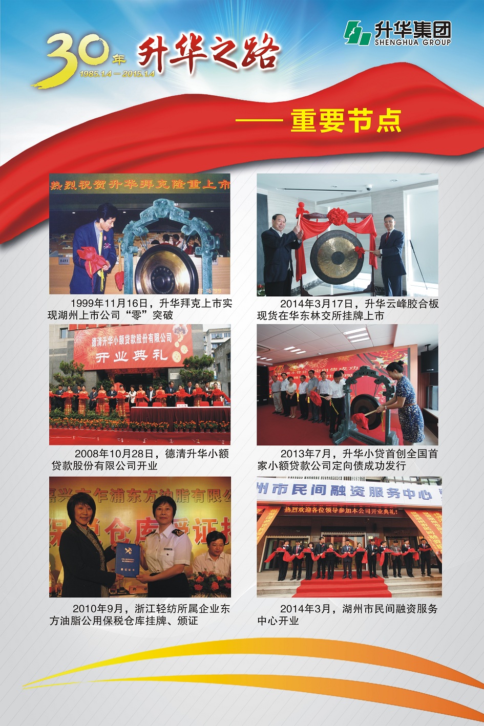升華集團(tuán)即將迎來(lái)創(chuàng)立30周年。30年,半個(gè)甲子,在風(fēng)和日麗與驚濤駭浪中,升華艦隊(duì)揚(yáng)帆遠(yuǎn)航,經(jīng)受風(fēng)雨的洗禮,也收獲成功的喜悅。為了喜迎升華創(chuàng)立30周年,回眸升華走過(guò)的不同尋常的征程,本報(bào)特意收集了“30年升華之路”系列圖片,陸續(xù)在集團(tuán)所屬各子公司巡回展出。圖片展的內(nèi)容分為創(chuàng)業(yè)之初、領(lǐng)導(dǎo)關(guān)懷、重要節(jié)點(diǎn)、黨群共建、管理提升、品牌升華、踐行責(zé)任、謙恭之行、轉(zhuǎn)型升級(jí)、榮耀升華等章節(jié)。