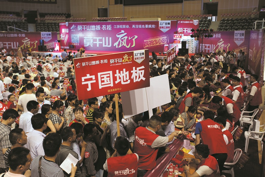6月7日,德清縣體育中心籃球館內(nèi)人聲鼎沸,“工廠空降 直銷江浙皖”,集團(tuán)所屬企業(yè)云峰新材莫干山衣柜•地板江浙皖三省聯(lián)動在這里掀起搶購熱潮。上千名莫干山品牌忠實(shí)消費(fèi)者從江蘇、安徽以及省內(nèi)各地趕來,搶購自己心儀的莫干山品牌衣柜、地板產(chǎn)品。短短的3個小時成交1200多個訂單?;鸨瑘雒娼蛔∽屓梭@呼:“莫干山瘋了!”